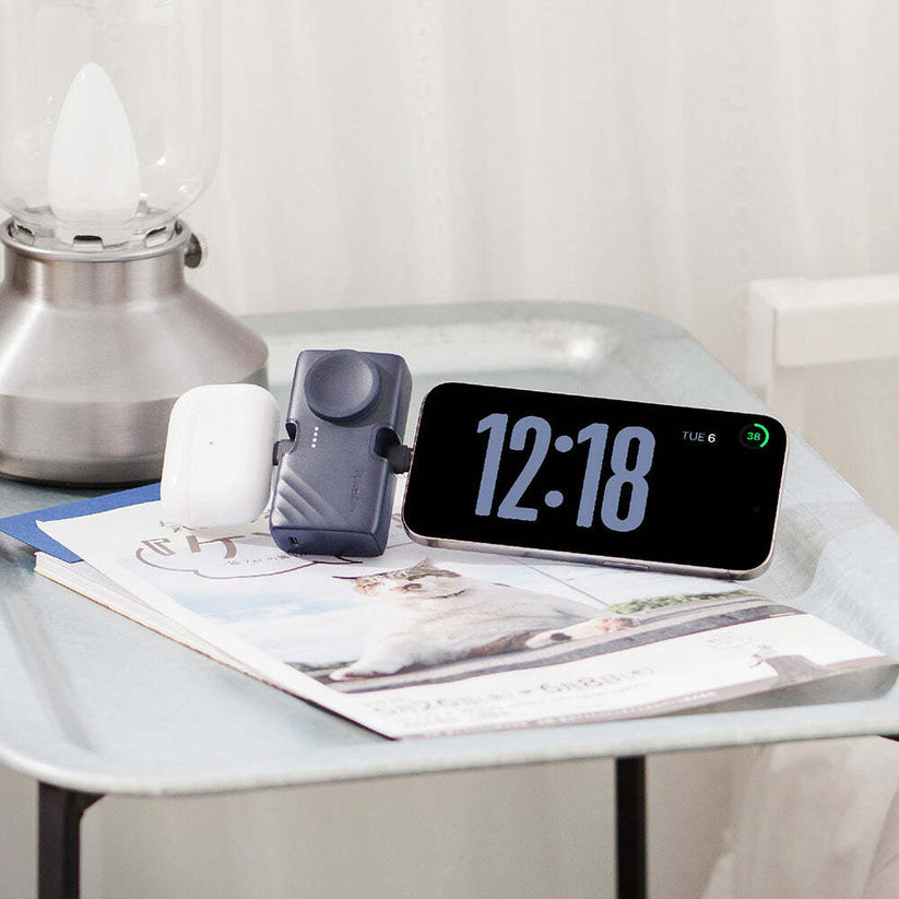 El diseño único del soporte le permite usar su dispositivo mientras se carga y funciona como un banco de energía portátil y un soporte móvil: conveniente para mirar videos mientras viaja.